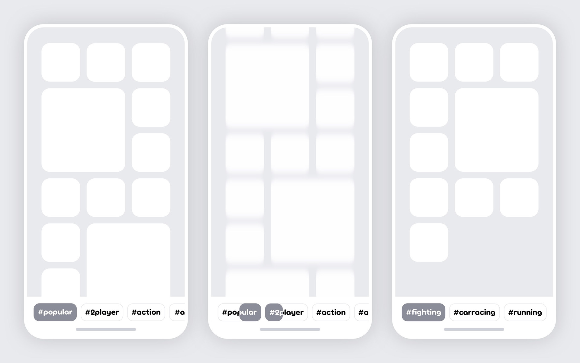 As the codename of this proposal suggests the bar has double functionality. If the user scrolls down the feed manually, the highlighted category bubble automatically switches depending on which category of games the user is scrolling through. A sort of index, always clearly displaying what category of games the user is looking at.
